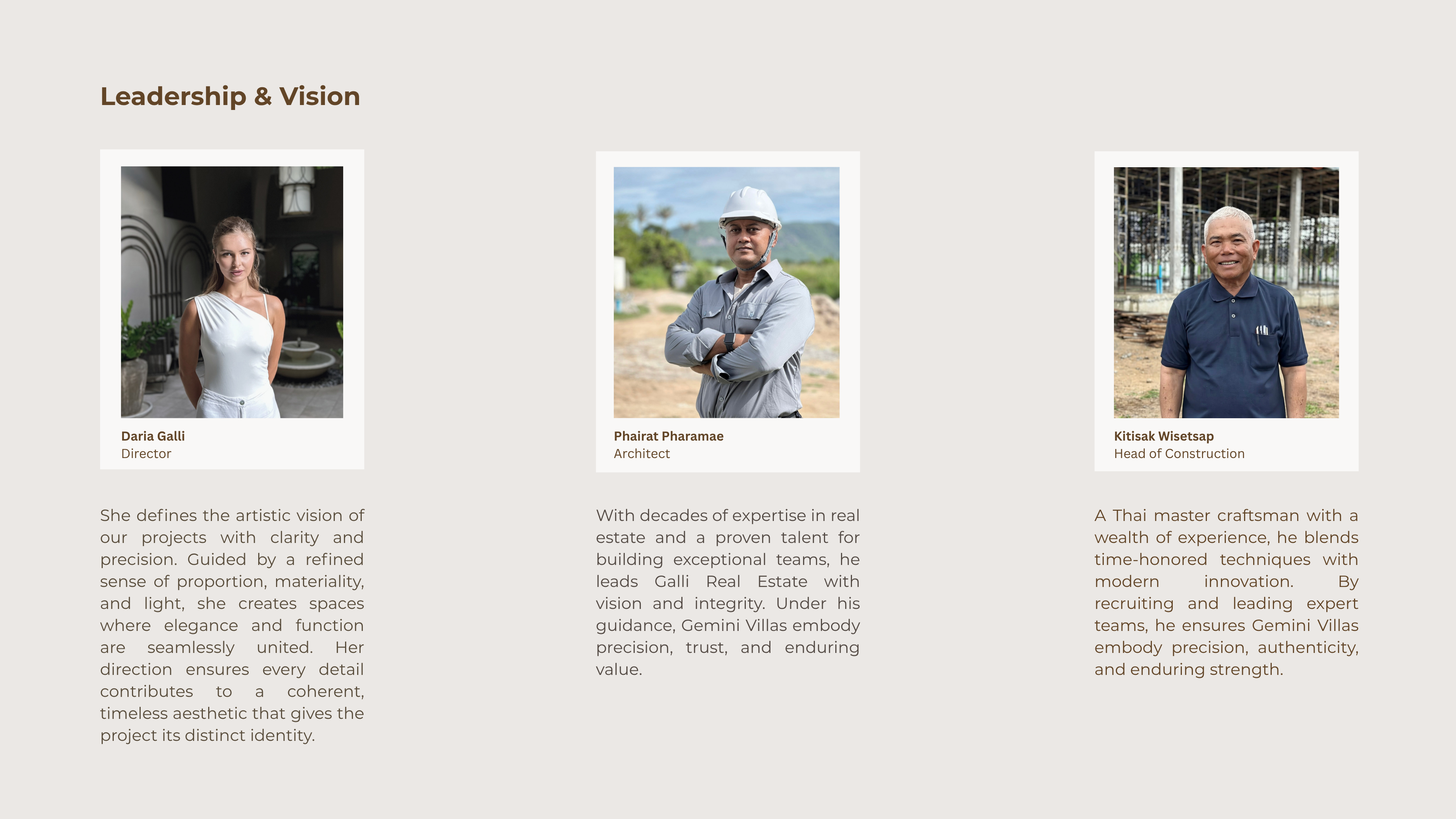 Each GALLI residence is shaped by a team that blends Swiss precision with Thai craftsmanship — uniting vision, design, and execution into one shared standard of excellence.